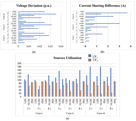 Comparative graphs: (a) voltage deviation, (b) current sharing difference, (c) utilization of parallel sources.
