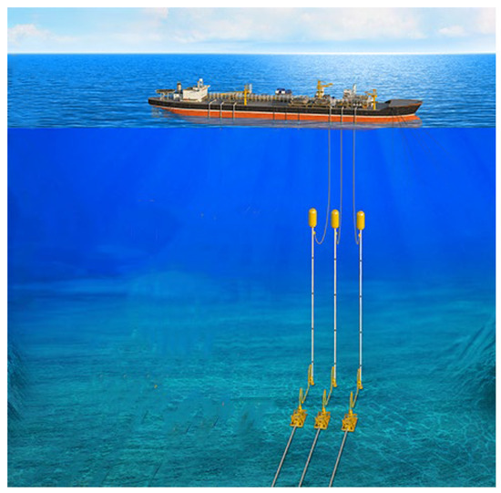 The hybrid riser system (Figure 3), alternatively referred to as the tower riser or free-standing riser, represents an advanced structural configuration that synergistically combines rigid pipe strings with flexible jumpers [38,39,40]. The hybrid riser employs a rigid vertical string (typically constructed of seamless steel pipes) at the base to establish a stable fluid conduit, while incorporating flexible jumpers at the top for connection to floating production storage and offloading (FPSO) units, thereby creating an effective mechanical decoupling mechanism [41,42]. This configuration proves particularly advantageous in marine environments where FPSOs and support vessels are subjected to dynamic wave-induced motions, including surge and heave. The hybrid riser design substantially attenuates motion transfer from the FPSO to the riser string, significantly reducing fatigue accumulation in critical components and enhancing the overall system reliability for extended operational durations [43,44].