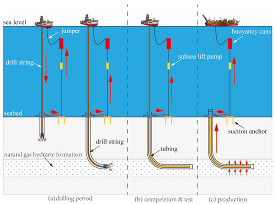 The direct discharge of drilling fluid is a critical challenge for environmentally sustainable and economically viable commercial NGH exploration and development. To address these challenges, this study proposes an innovative integrated system for deepwater NGH drilling and production that incorporates a hybrid riser with a riserless mud recovery (RMR) system. Simulation analyses confirm the system’s structural feasibility, where the hybrid riser system replaces the conventional mud return line in the RMR system. This integrated configuration offers three principal technical benefits: (1) the mechanical decoupling of the drilling/production platform from mud return line, eliminating direct hydrodynamic impacts from floating platform motions and surface marine environment; (2) the establishment of a closed-loop circulation pathway for NGH drilling, completion, and production operations, preventing direct discharges while reducing the total fluid consumption by approximately 70–80%; (3) the significant extension of the operational depth capabilities, with the RMR system now viable for water depths exceeding 3000 m—a 100% improvement over existing technologies. This innovative approach combines the advantages of both rigid riser and flexible jumper technologies while addressing the operational challenges associated with traditional RMR configurations.