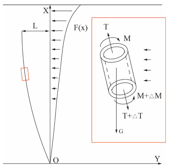 The hybrid riser-based RMR system experiences both longitudinal and transverse bending deformations when subjected to combined top tension and wave–current forces. For analytical purposes, the simplified mechanical model is shown in Figure 5.