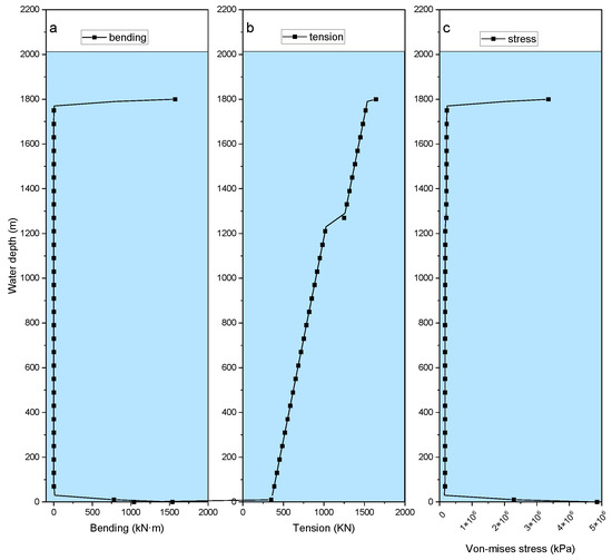 The simulation results (Figure 6) demonstrate systematic variations in the axial mechanical behavior of the mud return pipeline. Figure 6a reveals distinct jumps in the bending moment and stress at the system’s top and bottom nodes. The peak bending moments reach 1572.37 kN·m at the top connection node and 1537 kN·m at the bottom node, while the middle node exhibits near-zero values. These results demonstrate that the connection ends—particularly at the top buoy and seabed fixed point—constitute critical structural components for system integrity. Consequently, these regions require prioritized consideration in system design, with a particular emphasis on optimizing the nodal connection methodology. The axial tension decreases linearly from top to bottom, with a pronounced force discontinuity observed at 550 m below the mudline, corresponding to the submerged weight of the mud lift pump system. This confirms the pump body’s weight as the primary load source at this location. Subsurface currents exhibit a negligible influence on the axial tension, allowing for their omission in engineering calculations. Regarding the Von Mises stress distribution, minimal sectional variations were observed, with stress decomposition revealing axial tension as the dominant contributing factor. The structural design process must prioritize constraint mechanisms at the top and bottom nodal points. Spherical hinge connections are recommended to prevent the bending moments at connection nodes from exceeding their flexural capacity.