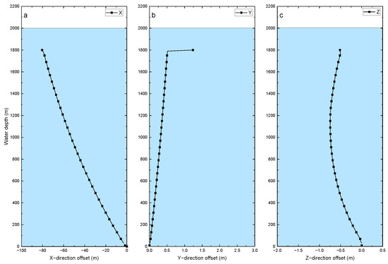 Bending deformation distribution of mud return line in longitudinal and lateral directions: (a) X−direction offset, (b) Y−direction offset, and (c) Z−direction offset.