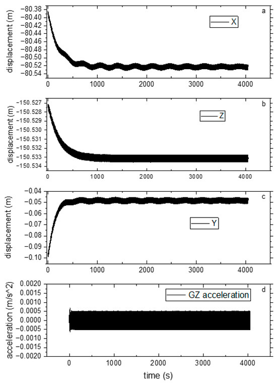 Through the continuous monitoring of the buoy displacement in three-dimensional space (X, Y, and Z axes), the dynamic response characteristics were systematically analyzed (Figure 8). The findings demonstrate a distinct motion attenuation trend, where the displacement amplitudes progressively diminish over time until reaching steady-state conditions.