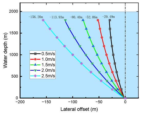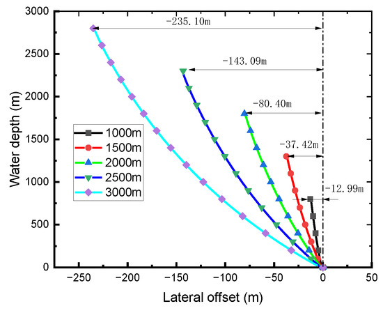The lateral offset of the top node of the mud return line under varying submersion depths.