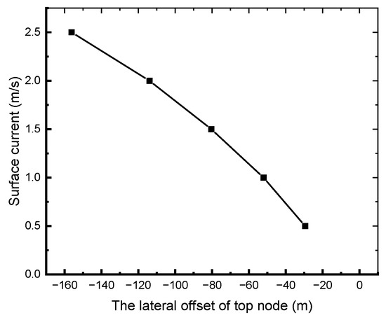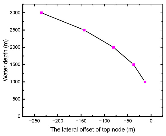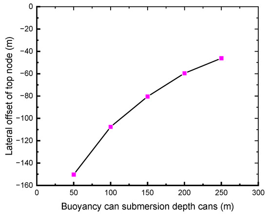 To investigate the effects of surface currents and wind waves on system deformation, this study analyzes the structural response while maintaining constant buoy specifications but varying the buoy’s submersion depth and rigid pipe string length. The results demonstrate that shallower buoy depths lead to increased lateral displacement of the riser string. Specifically in Figure 15, at a 50 m submersion depth, the buoy vertex exhibits a lateral y-displacement of −150.27 m, whereas, at a 250 m depth, this displacement reduces to −46.15 m. Figure 16 reveals a nonlinear trend in the maximum lateral displacement at the top with increasing submersion depths, although the rate of increase diminishes. For optimal engineering feasibility—particularly regarding jumper installation—the recommended buoy submersion depth ranges between 100 m and 250 m. Within this range, the lateral displacement remains under 80 m.