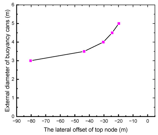 The lateral offset of the top node of the mud return line under varying external diameters of the buoyancy cans.