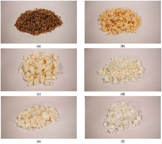 Initial cellulose samples after the cooking and washing section (a), after D0 (b), after AP1 (c), after D1 (d), after AP2 (e), and after D2 (f).
