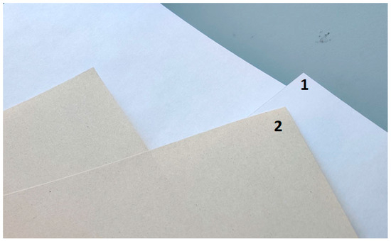 Office paper’s appearance and interaction with office equipment depend on its structural and dimensional qualities [12,13,14]. The most suitable paper weight for printing is believed to be 80 g/m2, since it gives sufficient rigidity and clarity to the print [15]. Office paper has a density of at least 0.75 g/cm3 and a bulkiness of 1.3 cm3/g, ensuring opacity and ease of printing [16]. The paper’s strength and flexibility are determined by the fibers’ composition, arrangement, and degree of size, while its roughness (150–250 Bendtsen) regulates the quality of image transmission and prevents distortions [17]. The capillary-porous structure of paper influences moisture absorption, the degree of sizing, and the ability to retain ink or toner [18]. The optimum humidity level (4–5.2%) is critical for the proper operation of laser printers. Because when the paper is over-moistened, the toner containing pigments and resins used to form images begins to crumble, and if there is insufficient moisture, static electricity accumulates on the paper, causing sheet jams. Hydrophobicity is controlled by the Cobb index: the lower the absorbency, the better the paper repels moisture. Printing requires that the paper absorb paint evenly and provide high-quality toner fixation.