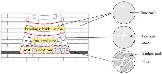 During the coal mining process at the working face, the coal seam will be affected by complex mining, which makes the internal fracture structure of the coal seam become complex. In the overburden strata layer, the damage degree of the coal rock body located in different zones varies greatly, which leads to changes in the permeability of gas and water transport. In the process of coal seam mining, the overburden rock structure usually forms a typical “three zone” structure, comprising the caved zone, fractured zone, and bending subsidence zone (Figure 1).