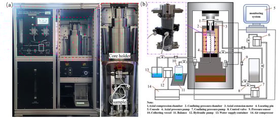 Figure 2 presents the self-developed small-scale conventional triaxial multi-field coupled experimental system for rock bodies. As shown in Figure 2, the system consists of a cabinet panel and liquid filling pump, a peripheral pressure chamber (including axial pressure and confining pressure loading pumps, with an axial pressure loading range of 0–70 MPa), an autoclave (size φ150 × 150 mm, pressure resistance of 30 MPa), a gas–liquid flowmeter (3 sets of different ranges with automatic switching capability), a hydraulic loading system (peripheral pressure loading range of 0–30 MPa), pressure sensors, and a data acquisition system. This system enables precise control and real-time monitoring of loading, strain, flow, pressure, temperature, and gas components in coal rock bodies under high-pressure and constant-temperature conditions.