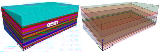 From the fitting equations, it can be seen that the permeability of the raw coal rock samples decreases exponentially with the increase in effective stress, whereas the permeability of the fracture coal rock samples is significantly higher, showing different permeability behaviors. These permeability formulas were embedded into the FLAC3D numerical model by means of FISH language scripts. These formulas will dynamically update the permeability of the coal rock body according to the different stress conditions of the unit, which becomes a module of the dynamic update of the permeability of the coal rock body, and realizes the coupling effect of stress and seepage in the model. The mechanics and seepage module of FLAC3D will combine the changes in the stress field and fracture field to simulate the expansion and deformation of the coal seam fractures during the mining process. Thus, the seepage characteristics of the aquifer during mining can be accurately reflected.