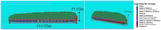 During the advancement process of the 110,901 working face in Luotuoshan coal mine, the actual measured height of the water-conducting fracture zone based on the monitoring and inversion of the leakage of drilling flushing fluid on site was 58 m. Therefore, in order to ensure the reliability of the numerical simulation results in this paper, the height of the water-conducting fracture zone development during the advancement process of the 110,901 working face was simulated, and the results are shown in Figure 8. According to Figure 8, the development height of the water-conducting fracture zone in the numerical simulation is 55 m, which is close to the development height measured on site. Therefore, it is considered that the numerical simulation results in this paper are reliable.