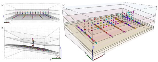 The simulated working face is arranged along the dip, with a length of 200 m, and advances along the strike, with an advance length of 400 m. In order to eliminate the boundary effect, a 50 m boundary-protective coal pillar is reserved around the working face; so, it advances along the x-axis from 50 m to 450 m, and five vertical monitoring lines (x = 50 m, 150 m, 250 m, 350 m, 450 m) are arranged along the strike; each line sets multi-level measurement points (Figure 9) on the coal seam roof (z = 35.5 m) and the overlying rocks above it (z = 50 m, 65 m, 80 m, 95 m). The coal seam roof (z = 35.5 m) and the overlying rocks above it (z = 50 m, 65 m, 80 m, 95 m) are set up with multi-layer measuring points (Figure 9), covering the dip range of the working face from y = 50 to 250 m. The main points are as follows: (1) Measuring points of coal seam roof (z = 35.5 m): they are set up along the dip at 10 m intervals, focusing on capturing the migration patterns of vertical stress concentration zones (the peak of the pressure of the over-abutting support). (2) Overlying fracture zone measurement points (z = 50~95 m): the stress and permeability of the overburden strata are monitored and distinguished from the permeability decay in the raw phase and the jumping behavior after plastic damage. In order to effectively capture the relevant data and evolution pattern of each measurement point, the monitoring interval of the model measurement points is set to 100 steps.