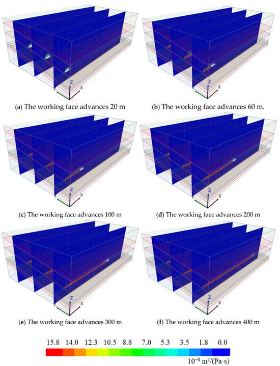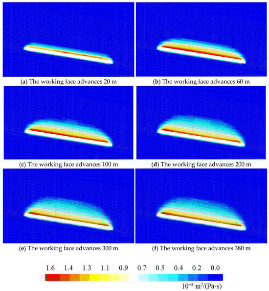 Figure 11 shows the evolution of the seepage field at the position of the X = 150 m slice of the model dip during the advancement of the working face along the strike. When the working face advances to 20 m (Figure 11a), the seepage field is mainly concentrated near the coal seam roof, and the permeability change area is relatively small, indicating that the initial mining influence is limited, and only a local permeability enhancement phenomenon is generated in the front of the working face and the boundary of the mining area. After advancing to 60 m (Figure 11b), the high permeability area expands upward, and the permeability of the fracture zone increases, indicating that the stress adjustment of the overburden strata of the coal seam has caused the initial formation of seepage channels. When advancing to 100 m (Figure 11c), the influence range of the seepage field is obviously enlarged, the rupture degree of the roof is intensified, the fracture network is gradually penetrated, and the permeability is increased as a whole. When advancing to 200 m (Figure 11d), the high permeability zone further develops upwards, the scale of the seepage channel expands, the connectivity of the fractures increases, and the transport capacity of the water and gas improves, indicating that the development of mining fractures has entered a mature stage. With advancement to 300 m (Figure 11e) and 380 m (Figure 11f), the distribution of the seepage field tends to stabilize, and the areas of high values of permeability remain at the boundaries of the fracture zones and goaf, which further verifies the controlling effect of overburden fractures on the permeability performance. Overall, the evolution law of the seepage field indicates that with the advancement of the working face, the formation and expansion of the fractures directly lead to the increase in permeability, and the permeability channel between the goaf and the fracture zone is gradually established and eventually tends to be stable. This study provides a scientific basis for coal mine water inrush risk assessment and seepage disaster prevention and control.