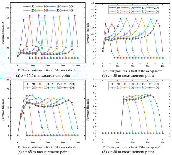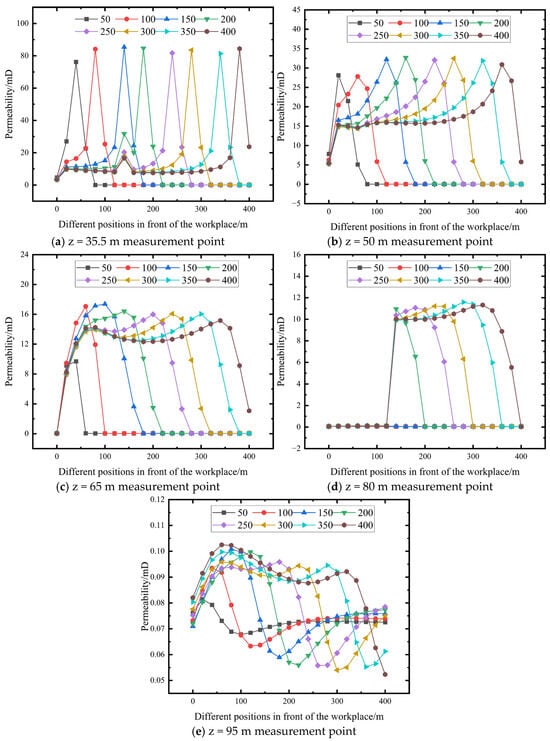 According to permeability monitoring data at the y = 150 m strike line (z = 35.5 m) during face advancement (Figure 12a), the spatial–temporal evolution of mining-induced permeability exhibits significant differentiation, reflecting the multi-physical coupling mechanisms of stress–fracture–seepage fields. When the working face advanced to 50 m, permeability ahead of the measuring line (x = 50 m) surged from 4.62 mD to 26.99 mD (484% increase), indicating plastic damage initiation in the roof strata under abutment pressure. At 200 m advancement, permeability at x = 250 m reached 81.67 mD—an order of magnitude higher than adjacent undisturbed areas—marking fracture network penetration. As advancement progressed to 400 m, permeability at x = 150 m peaked at 15.14 mD (228% increase from the initial point), demonstrating stress concentration migration with face progression. Post-advancement, permeability in the goaf rear (x ≥ 350 m) stabilized at 23.72 mD (4.1 × initial value), confirming persistent seepage channels through plastic zone fractures.