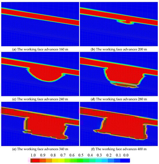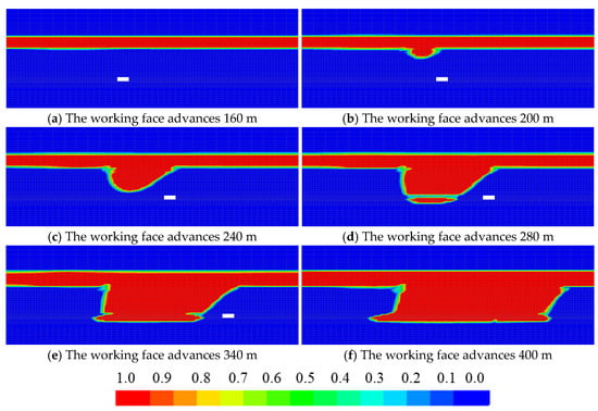 Figure 15 shows the saturation evolution characteristics at the location of the model dip X = 250 m slice during the advancement of the working face along the strike. From the simulation results, the plastic zone of the overburden strata gradually expands upwards as the working face advances and eventually connects with the upper aquifer, leading to water seepage. When advancing to 160 m, the plastic zone develops into the aquifer, meaning that the water-conducting fracture zone starts to affect the stability of the aquifer. At this time, the water flow seeps along the fracture to the goaf, forming a local seepage channel and posing a potential threat to the safety of the working face. When advancing to 250 m, due to further development of the fracture, water in the aquifer seeps into the goaf on a large scale, indicating that the pressurized water in the aquifer may have broken through the overburden barrier and entered the working face area. This process shows that the stability of the goaf is strongly influenced by aquifer seepage, which may lead to increased risk of a water breakout disaster.