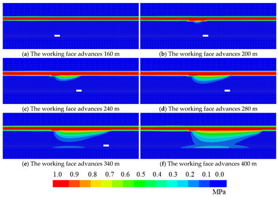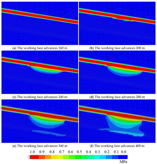 Figure 14 shows the evolution characteristics of the pore water pressure field at the location of the Y = 150 m slice of the modeled strike during the advancement of the workface along the strike. The change in pore water pressure shows a clear distribution trend as the working face advances. In the early stages of advancement (before 160 m), the pore water pressure was low and no significant permeability occurred. When advancing to 200 m, the pore water pressure at the measuring point began to rise significantly, especially at the measuring point close to the mining area; the pressure gradually increased, indicating that the water in the aquifer began to infiltrate into the mining area. To more than 250 m, drastic changes appeared in the pore water pressure at a number of measurement points; the pressure peak was obviously related to the concentration of the goaf, indicating that the seepage formed a stable channel and that the working face was affected by water intensification. As it advances to 400 m, the seepage path expands further, and the risk of water damage rises significantly. Therefore, in the actual mining process, we should focus on the evolution of pore water pressure after advancing to 200 m and strengthen the over-drainage and reinforcement measures in order to reduce the risk of water breakout and guarantee the safety of the working face.