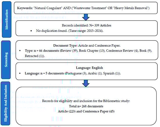 To examine trends and developments concerning the use of natural coagulants in wastewater treatment for heavy metals removal, this study employed bibliometric analysis. Data were sourced from the Scopus database, covering the period from 2015 to December 2024. The selection of the Scopus database was based on its extensive repository of pertinent published articles and its comprehensive coverage of high-quality, peer-reviewed literature [17]. This ensures the reliability and relevance of our analysis, making it an ideal choice for this research. The literature search utilized the following query string and keywords: “(TITLE-ABS-KEY ((“Natural Coagulant”) AND (“Wastewater Treatment” OR “Heavy Metals Removal”)) AND PUBYEAR > 2014 AND PUBYEAR < 2025 AND (LIMIT-TO (LANGUAGE, “English”)) AND (LIMIT-TO (DOCTYPE, “ar”) OR LIMIT-TO (DOCTYPE, “cp”)) AND (LIMIT-TO (SRCTYPE, “j”) OR LIMIT-TO (SRCTYPE, “p”))). This methodological approach ensured a focused and relevant dataset for the analysis of current trends in the field.