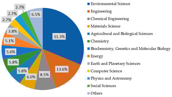 The analysis indicated that “environmental science” was the predominant discipline, accounting for 31.3% of the studies, followed by “engineering” and “chemical engineering,” which represented 13.6% and 8.5%, respectively. This distribution highlights the interdisciplinary nature of research in this field and the importance of collaboration among various scientific domains. Such collaboration is vital for addressing the complex challenges posed by wastewater treatment and developing comprehensive solutions.