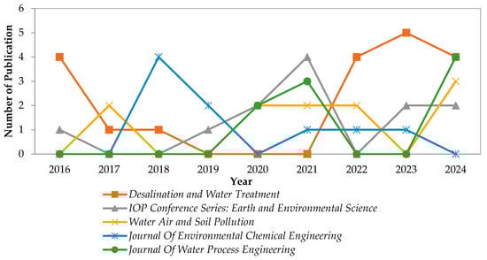 As shown in Figure 8, The leading journal, Desalination and Water Treatment, has published a total of 19 articles. Its publication trend shows notable activity, particularly in recent years, with four articles in 2016, followed by one in 2017, one in 2018, and a resurgence with four in 2022, five in 2023, and four in 2024. This pattern indicates a growing urgency in addressing wastewater treatment issues and highlights the journal’s pivotal role in advancing knowledge in this critical field. Following closely, IOP Conference Series: Earth and Environmental Science has contributed 12 publications, with a varied output over the years. The journal published one article in 2016, one in 2019, two in 2020, and saw a peak in 2021 with four articles. Its output in 2023 and 2024 remained steady with two articles each year, showcasing its importance in facilitating discussions on environmental science.