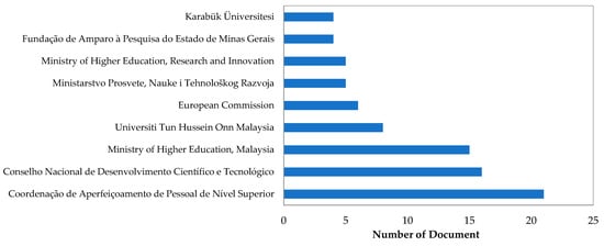 As shown in Figure 9, leading the list is the Coordenação de Aperfeiçoamento de Pessoal de Nível Superior with 21 publications, indicating a strong commitment to enhancing research capabilities and promoting higher education in Brazil. This substantial support underscores the importance of natural coagulants in addressing wastewater treatment challenges. Following closely is the Conselho Nacional de Desenvolvimento Científico e Tecnológico, which has funded 16 publications. This organization plays a crucial role in financing scientific research in Brazil, reflecting its dedication to environmental studies and innovation in wastewater management.