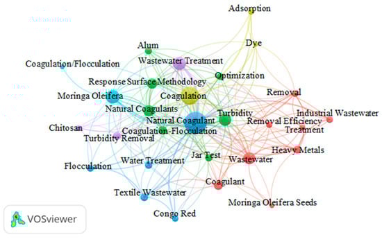 In this context, Figure 10 displays a network diagram that illustrates the co-occurrence of keywords identified in research articles focused on the application of natural coagulants in wastewater treatment.