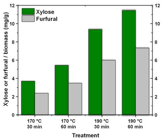 It is important to note that, although an increase in time allows the increased generation of both xylose and furfural at the two temperatures evaluated, its influence is not as extensive as that of the temperature. Thus, it can be stated that at higher temperatures the reaction conditions are more ideal, positively affecting the hydrolysis process of hemicellulose. In the same way, hydrothermal treatment is mainly a hybrid treatment between a physical process and a chemical process; for instance, when water is in a subcritical state, it acts as a Brönsted acid and promotes the hydrolysis of biomass [21].
