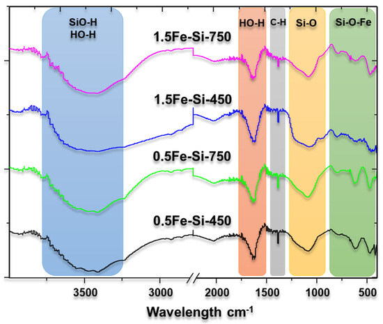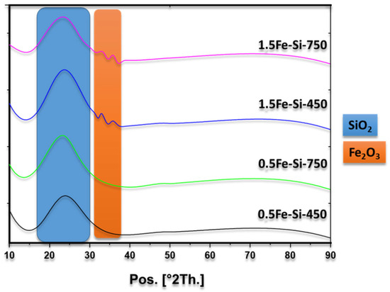 Figure 2 shows a broad peak at 2θ = 22°, which is assigned to amorphous silica [22,23,24]. No peaks attributed to iron species are observed for materials with an iron charge of 0.5 wt% (0.5Fe-450 and 0.5Fe-750). This is due to the high degree of dispersion of active species associated with the process of sol–gel synthesis. For materials with an iron charge of 1.5 wt% (1.5Fe-450, 1.5Fe-750), two broad peaks related to silica are observed at 2θ = 33 and 35° which can be assigned to species of iron oxide type hematite JCPDS: 33-0664 [25,26,27]. It is essential to highlight the presence of hematite-type iron in which the metal has an oxidation state of Fe3+ [28]. For the reaction of xylose dehydration to furfural, Fe3+ acts as a Lewis acid, promoting the isomerization of xylose to xylulose.
