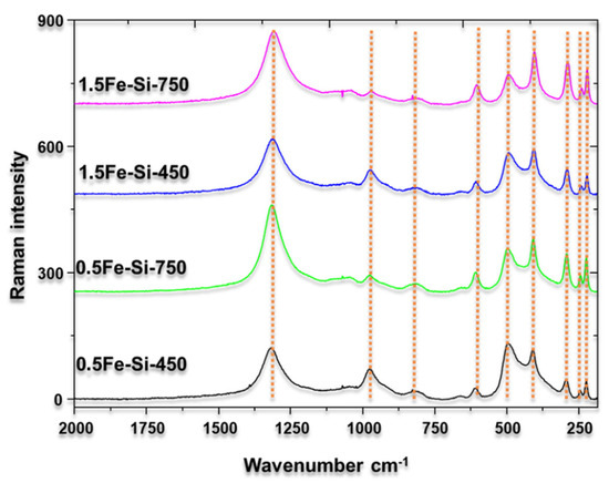 Figure 4 shows the Raman peaks of the synthesized iron materials. An intense peak at around 1300 cm−1 is associated with hematite-type iron species [35]. In this regard, a greater intensity is observed in materials synthesized at 750 °C than those calcined at 450 °C. This is attributed to the more significant number of species formed at 750 °C, the temperature at which iron mostly has an oxidation state of Fe3+. At 450 °C, a mixture of iron Fe2+ and Fe3+ is present. Additionally, peaks at 225, 245, 292, 390, 500, 615, and 960 are associated with hematite-type iron [36,37]. Based on the above information, the presence of iron is complemented and confirmed by its higher oxidation state, which acts as a Lewis acid during the dehydration reaction of xylose to furfural.