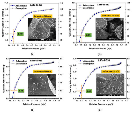 The adsorption and desorption isotherms of iron materials supported on silicon oxide are presented in Figure 5. Importantly, during nitrogen adsorption at pressures lower than 0.1 (p/p0 < 0.1), a filling of the surface by a monolayer of N2 occurs [38,39]; hence, a limit was determined at this relative pressure to identify the adsorbed volume of N2, which was related to the synthesis conditions of each material. Type II isotherms are observed when comparing the samples calcined at 450 °C with a load of 0.5 and 1.5% in mol of iron (Figure 5a,b) [39]. In this case, the surface is 730 and 693 m2/g, respectively. Based on the surface area values, the sample with the lowest iron load and calcined at 450 °C (0.5Fe-450) required a more significant amount of nitrogen to fill the monolayer (8.49 mmol/g). The material with the highest load and calcined at the same temperature (1.5Fe-450) required 8.05 mmol/g of N2. This allows us to observe the influence of iron loading on the structural formation of the silicon lattice. The higher iron loading produces structures with a lower surface area due to the higher formation of Si-O-Fe bonds.