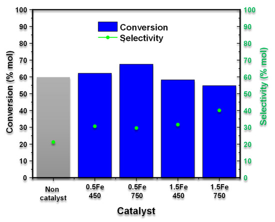 Figure 6 shows that regardless of the calcination temperature, the highest iron load (1.5Fe-450 and 1.5Fe-750) generates the lowest values of xylose conversion, 58.27 and 54.76% in mol. However, the higher iron loading increased the selectivity to furfural, 31.62 and 40.09% in mol. In this way, the higher iron loading decreases the number of silanol groups (Si-OH) and, therefore, the activation and initial conversion of xylose. However, this higher iron load generates more active iron centers, which favor the formation of furfural. Likewise, comparing the calcination temperature between materials with a higher iron load (1.5Fe-450 and 1.5Fe-750), we observed that the catalyst calcined at 750 °C was more selective towards furfural, 40.09% in mol. Therefore, the higher calcination temperature promotes the formation of hematite-type iron species (Fe3+), which act as a Lewis acid and favor the formation of furfural [46,47].