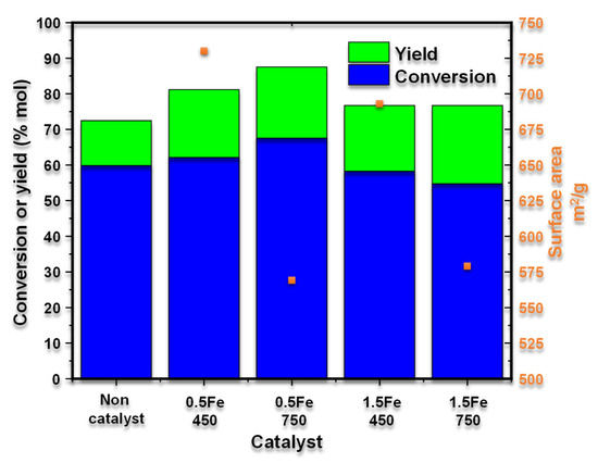 The effect of the surface area on xylose conversion and yield to furfural is presented in Figure 7. It highlights that the material with the most significant area (730 m2/g) is obtained at the lowest calcination temperature (450 °C), has a low iron load (0.5Fe-450), and generates a conversion of xylose and selectivity to furfural of 62.14 and 30.61% in mol, respectively. Hence, a larger surface area maximizes the access of the reagents, promoting collisions between them, and influencing the selectivity of the process.