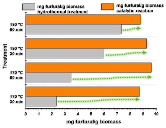 Regarding the hydrolysates obtained at 190 °C (30 and 60 min), we observed that the hydrothermal process carried out for 30 min and then catalytically for 30 min shows increased furfural production from 5.99 to 9.26 mg of furfural/g of biomass, while for 60 min, the hydrothermal and catalytic process increases from 7.32 to 8.81 mg of furfural/g of biomass. Therefore, in all cases, furfural production increases using an iron catalyst supported by silicon oxide. The most significant increases were observed in the hydrolysates obtained at a lower temperature (170 °C) than those obtained at 190 °C.