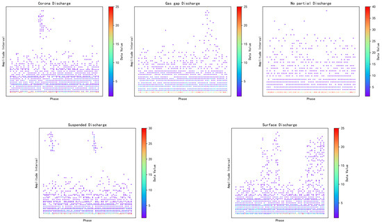 A total of 1426 PRPD maps were collected, with a resolution of 515 × 389. In these maps, the horizontal axis represents the normalized phase of a single cycle (0–360°), while the vertical axis indicates the amplitude range. The grid color intensity represents the frequency of occurrences within a specific amplitude range for each phase window. Figure 2 shows the PRPD maps for four types of partial discharge defects, as well as the one with no PD condition. To simulate a small sample scenario, 50 maps shown in Table 1 are randomly selected from each defect category for use in partial discharge pattern recognition. The selected dataset is then divided into a training set and a testing set at a ratio of 4:1 to ensure a fair evaluation of the model’s performance in limited-data conditions.