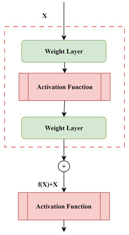 It should be noted here that some typical discharges are difficult to obtain generally, and hence, sometimes, only small sample datasets can be obtained. However, small samples are prone to overfitting and degradation during the training of the models. Here, a residual neural network, proposed by He et al. [24], is employed to avoid the emergence of this circumstance. The residual unit, as shown in Figure 3, which is the fundamental building block of a residual neural network, mainly adds the output of the previous layer directly to the output of the current layer through an additional connection, serving as the input for the subsequent layer.