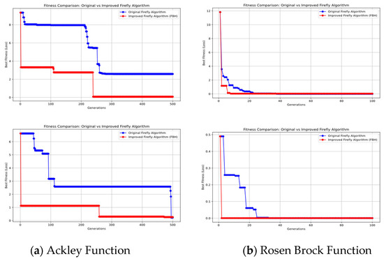 Figure 4 presents the fitness evolution curves for two benchmark functions. Specifically, subfigures (a) and (b) illustrate the fitness variations of the original Firefly Algorithm and the improved FBH algorithm on the Ackley and Rosenbrock functions, respectively. It can be observed that the fitness of the FBH algorithm converges rapidly in the early stages, which is due to the introduction of the Black Hole Mechanism in the FBH algorithm’s iteration process. This mechanism increases the disturbance of particles in the search space, enabling the algorithm to find better solutions early on. Furthermore, the Black Hole Mechanism effectively prevents the algorithm from getting trapped in local optima by simulating the phenomenon of particles entering a black hole, demonstrating superior performance, especially on the Ackley function.