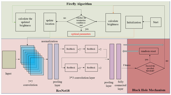 The FBH algorithm iteratively guides the hyperparameters of ResNet18 to update in the direction that maximizes the fitness value, providing a better initialization for the model at the start of training. The Black Hole Mechanism introduces a dynamic threshold strategy, where solutions that exceed a certain fitness threshold are “pulled” into the black hole and reinitialized. This mechanism ensures that the optimization process avoids getting trapped in local optima by exploring the search space more effectively. This optimization strategy enhances the model’s convergence speed and recognition accuracy, especially in terms of its generalization ability on small sample datasets. The introduction of the Firefly Algorithm combined with the Black Hole Mechanism offers an efficient and robust solution for hyperparameter optimization. Its global search capability effectively circumvents the local optimum pitfalls of traditional methods, while the swarm intelligence mechanism enables rapid exploration of the parameter space. This novel approach, which integrates swarm intelligence and deep learning, not only improves model performance but also provides new research insights for solving similar small sample learning problems. The complete process of optimizing a residual convolutional neural network using the FBH algorithm is illustrated in Figure 5.