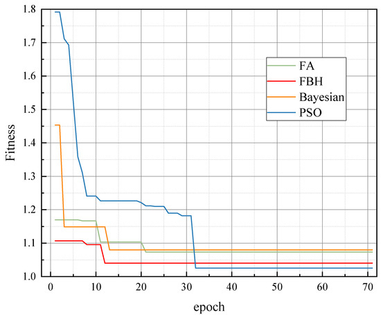 For comparison, additional experiments were conducted using Bayesian optimization and Particle Swarm Optimization (PSO) to optimize the same neural network hyperparameters. Figure 6 clearly illustrates the convergence behavior of all tested optimization algorithms. In the initial training phases, the improved Firefly Algorithm (FBH) exhibits a notably faster convergence speed compared to Bayesian optimization, PSO, and the original Firefly Algorithm (FA). This rapid descent in fitness value in the early iterations suggests that FBH is more effective at quickly identifying promising regions of the hyperparameter space and escaping initial local optima. Furthermore, FBH achieves a consistently lower final fitness value than FA and Bayesian optimization, indicating that it finds better overall hyperparameter configurations.