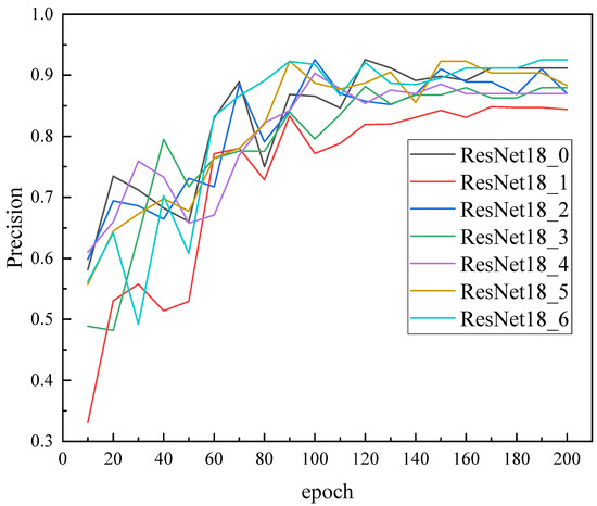 The performance of the optimized ResNet18 models is further evaluated by their precision curves and the time required for hyperparameter optimization, as presented in Figure 11 and Table 4, respectively.