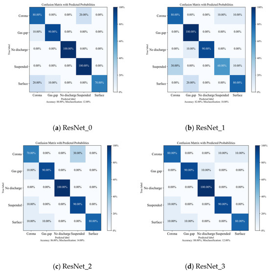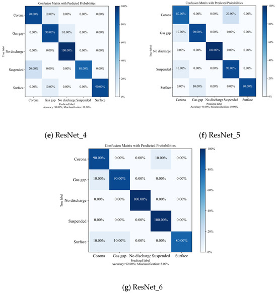 Figure 9 shows the partial discharge classification confusion matrix for the residual network model with five hyperparameter settings after 200 generations of training. Overall, the proposed improved ResNet18 model achieves the highest overall accuracy of 92%, significantly higher than the recognition accuracy of models with other parameter settings, such as Model 1 (82%) and Model 2 (86%). Furthermore, the improved residual network model demonstrates high accuracy in predicting each category. For example, the accuracy for predicting “no partial discharge” reaches 100%, indicating that the classification criteria for this category are very accurate with no misclassifications. This result highlights the advantage of parameter optimization, enabling the neural network to effectively capture key features of different partial discharge patterns. Additionally, although there are some misclassifications in the surface discharge category in Model 6, it can be said that the accuracy for each category remains relatively high, indicating that the model’s classification results are more balanced and possess strong generalization capability.