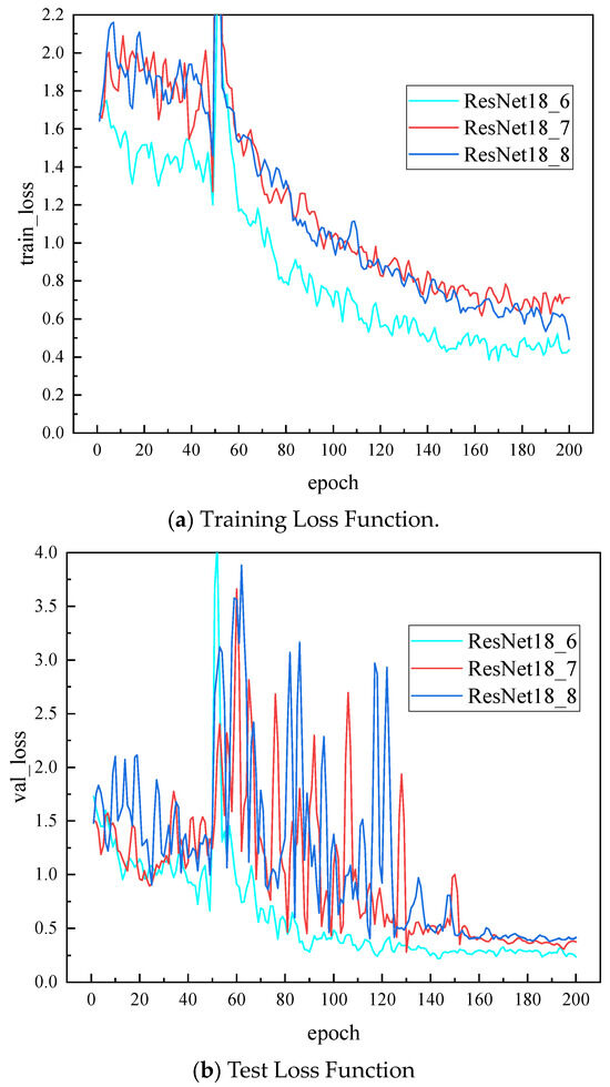 The loss function curve relative to the number of iterations during the training process of different deep learning networks is shown in Figure 7. In the training set, the FBH-optimized improved ResNet18 model demonstrates robust performance. Compared to other models with initial losses greater than 1.70, the initial loss value (1.6845) is significantly smaller. Moreover, the loss function of the improved ResNet18 model decreases rapidly during the first 100 iterations. Afterward, the loss steadily declines, and the final training loss stabilizes at a lower level, indicating that the new model proposed in this paper has the advantages of a lower initial loss and faster convergence in the training set. In the test set, the loss function of the improved ResNet18 model decreases rapidly during the first 60 iterations, suggesting that the improved ResNet18 model has the advantage of fast and stable convergence in the early stages of training. In the middle of the training process, all models show a stable reduction in loss. After 100 iterations, the models approach stability. Upon completion of training, the FBH algorithm-optimized ResNet18 model achieves a final minimum loss of 0.250785, whereas the final loss values of the other models are 0.3075, 0.5149, 0.2736, 0.3459, 0.3040, and 0.30815, respectively. This indicates that the proposed improved algorithm can reduce the test set loss to some extent and has strong generalization capability.