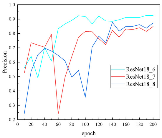 As depicted in Figure 11, which illustrates the optimized network precision curve, ResNet18_6 (optimized by FBH) consistently achieves the highest precision throughout the training process compared to ResNet18_7 (Bayesian optimization) and ResNet18_8 (PSO). While all models show an increasing trend in precision, ResNet18_6 demonstrates a more rapid ascent and ultimately reaches and maintains a higher plateau of precision. Specifically, after 200 iterations, the final precision values for ResNet18_6, ResNet18_7, and ResNet18_8 are 0.9255, 0.8485, and 0.8731, respectively. This quantitative evidence further confirms ResNet18_6’s superior performance, indicating the FBH algorithm’s effectiveness in fine-tuning the ResNet18 architecture for more accurate partial discharge pattern recognition.