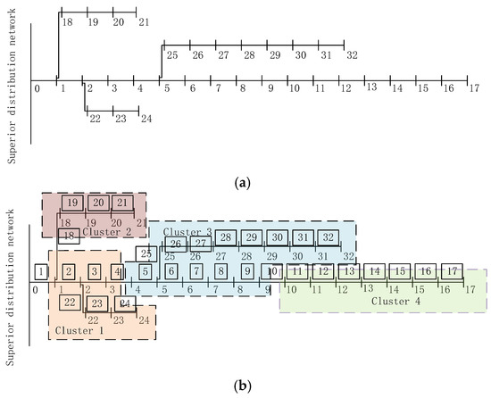In this cluster structure, there are the following three types of branches: (1) intra-group branches, which are branches that connect nodes in the same cluster, just like branches 5–9 in Cluster 3 in Figure 1b; (2) inter-group interactive branches, connecting branches of different clusters, such as branches 4, 10, 18; (3) The main network liaison branch, the branch that connects the bus and the nodes in a certain cluster, such as branch 1 between the upper-level distribution network and Cluster 1 in Figure 1b.