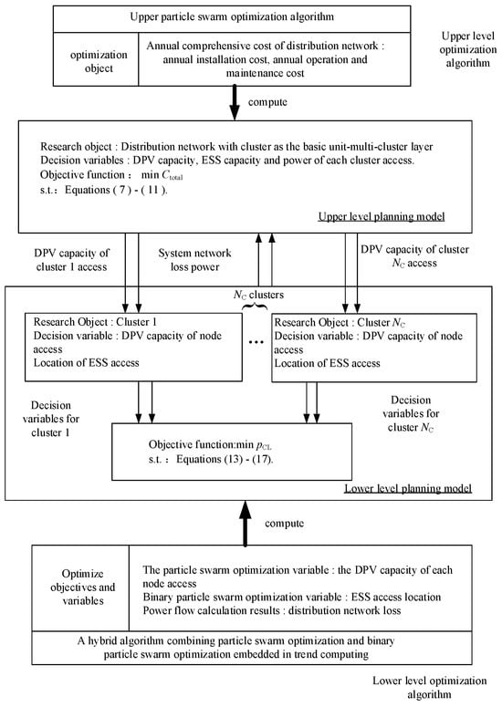 A two-layer coordinated planning model of DPV and ESS site and capacity is established according to the distribution network-cluster-node hierarchical planning strategy described in Section 2.3, and the model architecture is shown in Figure 2.