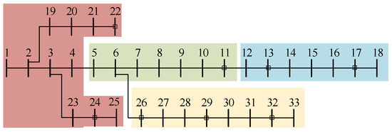 In power system analysis, the cluster partition index is a quantitative criterion used to evaluate and determine the optimal zoning scheme for distribution networks. By comprehensively considering factors such as network topological structure and electrical characteristics (such as voltage and power), it divides complex power grids into multiple relatively independent sub-clusters with strong internal connections, so as to achieve coordinated control of distributed power sources, fault isolation, and optimal scheduling. The comprehensive performance index of clusters can be constructed by integrating multiple single-item indicators related to the operation of the distribution network. It is a quantitative basis used to comprehensively evaluate the effect of cluster partitioning and operational characteristics. Using the cluster partition index proposed in Ref. [15], the power grid is divided into a several sub-clusters (or sub-regions) structure, and the best partitioning schemes are obtained by calculating the comprehensive performance index, so as to obtain the cluster partition results, as shown in Figure 1.