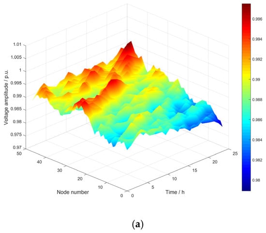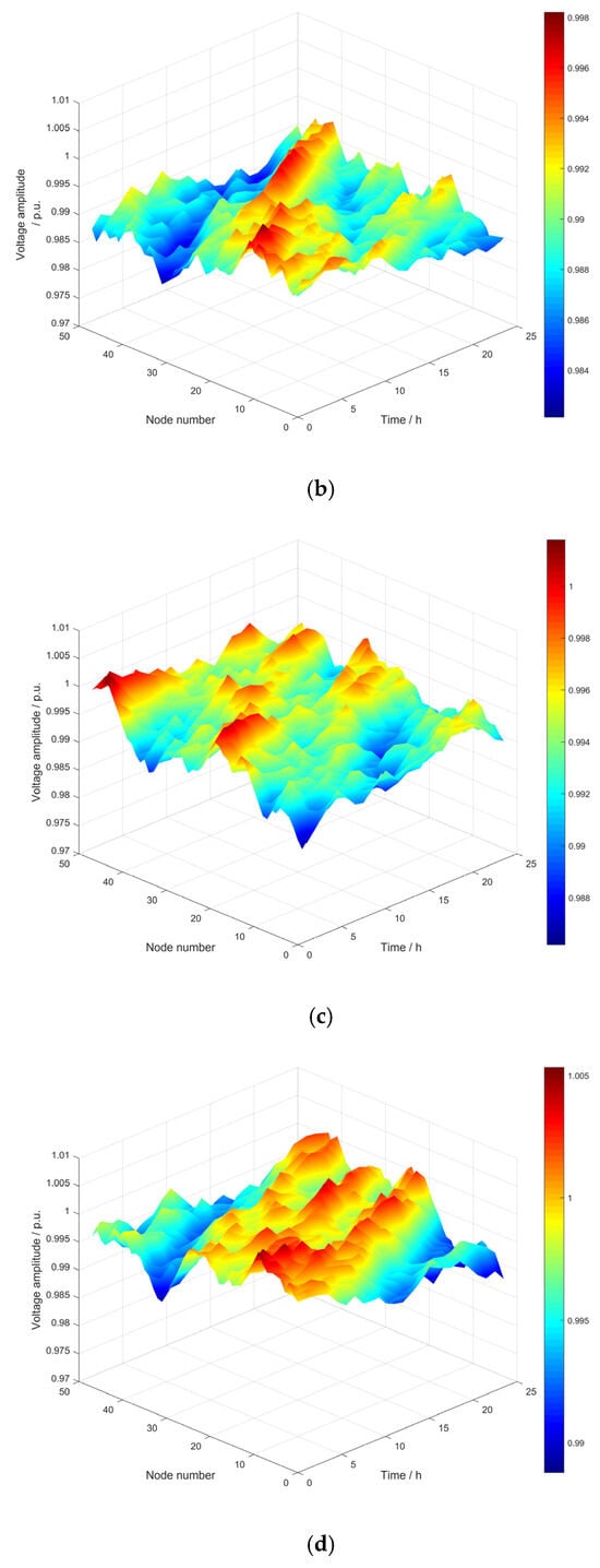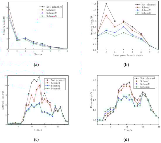 - The proposed method incorporates zoning during the planning phase, which brings significant improvements. In Scenario 3, compared with the original system, the annual intra-group network losses of clusters 1–3 decreased to 63.03%, 69.05%, and 71.67% of the original system, respectively, and the inter-group branch network losses decreased to 47.59–63.65% of the original system. During 7:00–18:00 of a typical day, the proportion of system network losses and power losses in Scenario 3 decreased significantly. At 13:00, the proportion of system network losses decreased to 37.06% of the original system, and the proportion of power losses decreased to 72.69% of the original system. Also, the minimum node voltage increased from 0.977 before planning to 0.985 in Scenario 3, and the voltage fluctuation index decreased by 13.67% compared with that before planning. Additionally, the hierarchical planning in Scenario 3 converges faster with fewer iterations, greatly boosting the optimization efficiency.