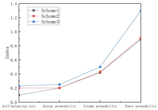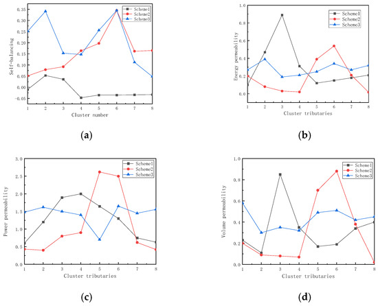 - The configuration results of each scheme are compared from the two levels of distribution network and cluster using comprehensive indicators. At the cluster level, in terms of the self-balancing indicator, the self-balancing degree of each cluster in Scenario 3 is relatively high, ranging stably between 0.15 and 0.35, and it is evenly distributed among clusters. In contrast, in Scenario 1, only cluster 3, and in Scenario 2, only clusters 5 and 6 have relatively high self-balancing degrees, while others are low with large distribution differences. For the Energy permeability, Capacity permeability, and Power permeability indicators, the DPV penetration rate in Scenario 3 is relatively high and evenly distributed among clusters. For example, in the Capacity permeability indicator, the values of each cluster in Scenario 3 do not exceed the critical value of 1, indicating a more reasonable configuration. At the distribution network level, Scenario 3 shows the best performance in indicators such as self-balancing rate, energy permeability, capacity permeability, and power permeability. The comparison results verify that the proposed cluster-based planning method can effectively improve the autonomy of the cluster and distribution system.