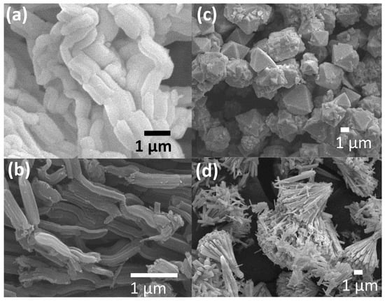 SEM images of (a) SBA-15, (b) CMK-3, (c) CeO2 MPs, and (d) CeO2 NFs synthesized in this study.