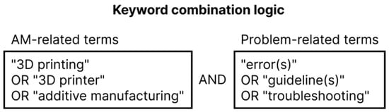 To ensure comprehensive coverage, the literature search was conducted across major academic databases, including Google Scholar, ScienceDirect, PubMed, and IEEE Xplore. The search targeted publications from 1 January 2000 to 31 July 2024. Keywords used in the search included combinations of terms such as “3D printing”, “3D printer”, or “additive manufacturing” with “error(s)”, “guideline(s)”, or “troubleshooting”, specifically within the article titles. This ensured that studies addressing errors and guidance related to 3D printing and additive manufacturing were inclusively identified. The keyword combination logic used in this title-based search is summarized in Figure 1.