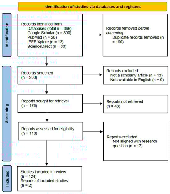 The initial search yielded a total of 366 studies. After removing duplicates, 200 unique studies remained. Applying the first exclusion criteria resulted in 143 eligible papers. A second round of screening was then conducted, and studies that did not align with the research questions were excluded. As a result, a final set of 126 studies was selected for full analysis and data extraction. No automation tools were used during the selection process; all screening and eligibility assessments were conducted manually based on the predefined criteria.